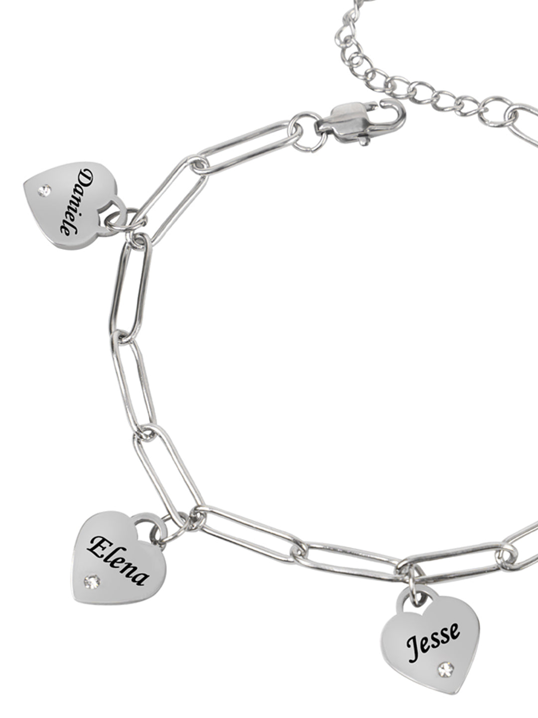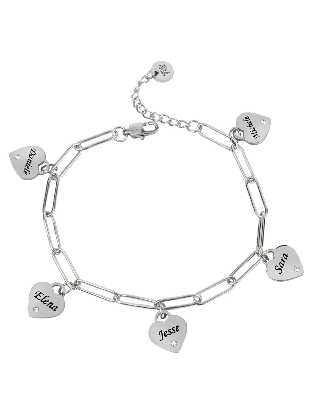 Porta il tuo amore sempre con te con il Bracciale con Charm Cuoricini! Personalizzabile con 5 nomi, è il regalo perfetto per mostrare il tuo affetto. Realizzato in acciaio inossidabile, è resistente e di qualità. Lascia che i cuoricini siano il tuo messaggero d'amore.