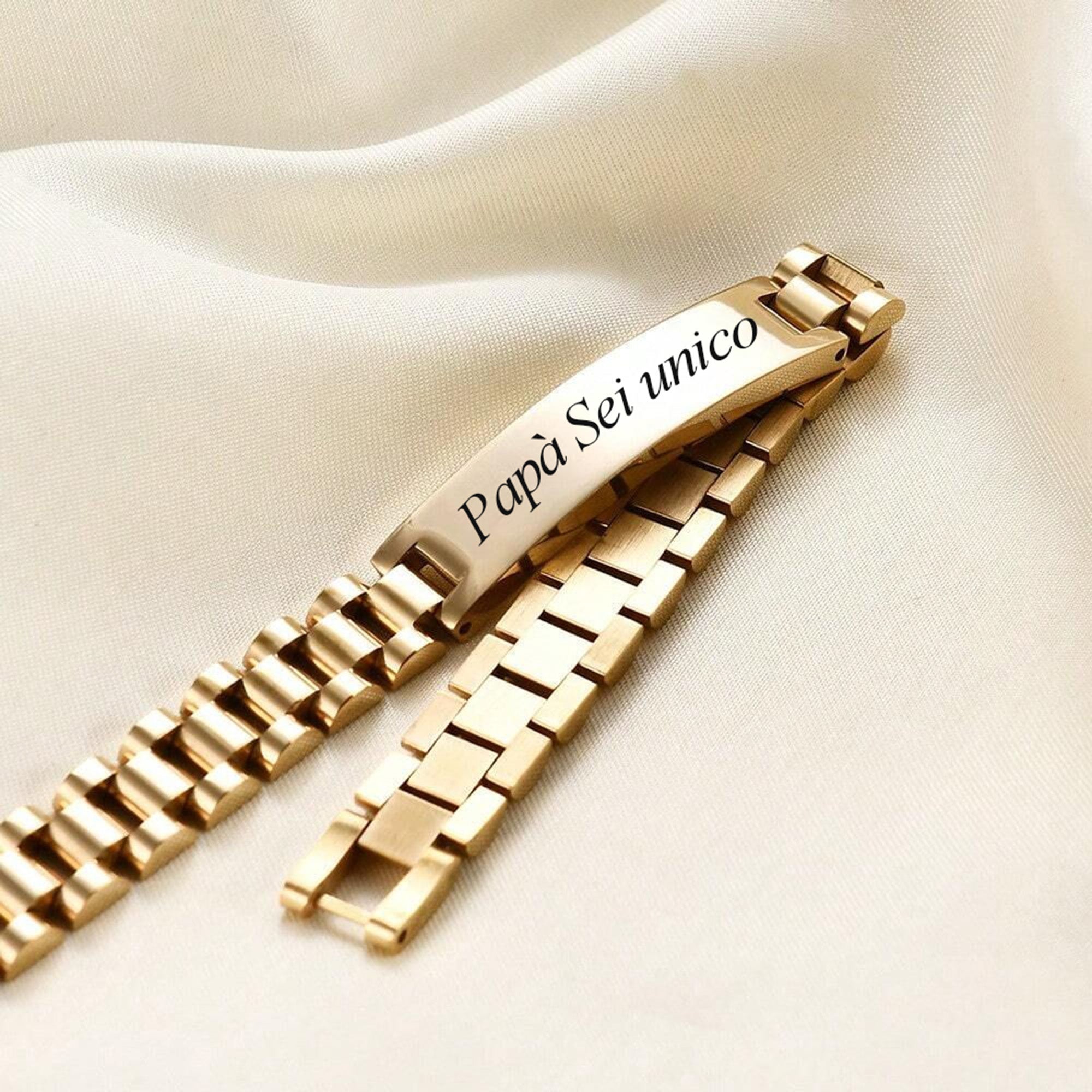 Eleva il tuo stile con il nostro bracciale da uomo, una fusione di eleganza e personalizzazione. La maglia raffinata, ispirata all'iconico design degli orologi di lusso, abbraccia il polso con maestria.