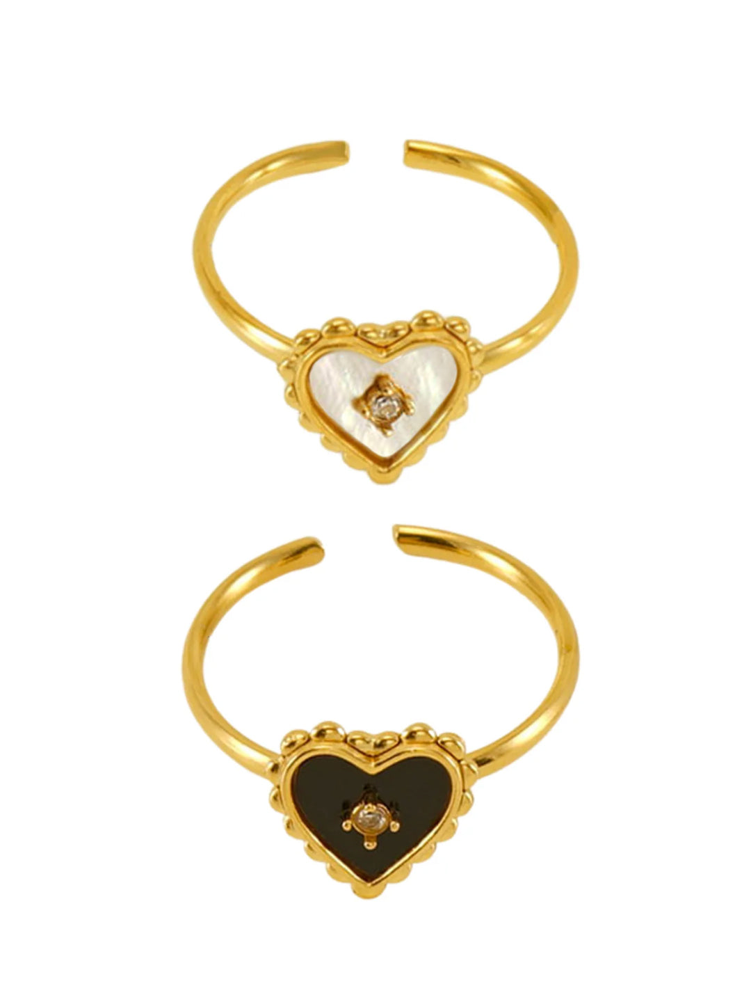Questi eleganti anelli regolabili in oro presentano un design a cuore, uno con inserto nero e l'altro bianco. Al centro del cuore, una piccola pietra scintillante aggiunge un tocco di raffinatezza e luminosità. La cornice a piccoli dettagli dorati conferisce loro un aspetto romantico e prezioso, perfetti per aggiungere un tocco chic a qualsiasi outfit.