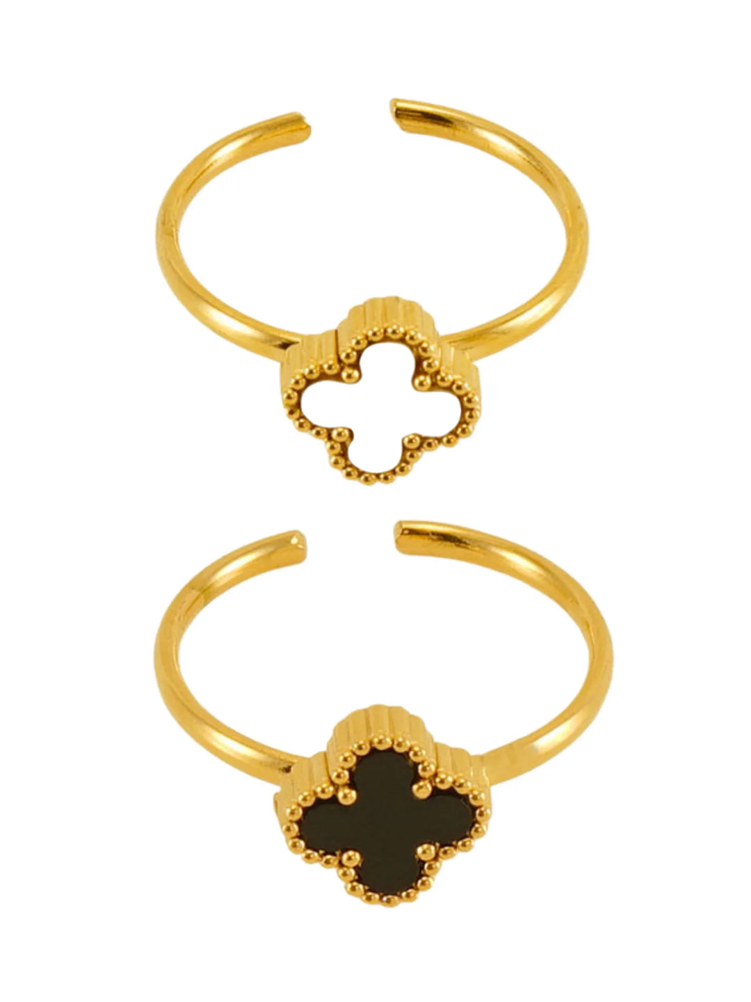 Questi raffinati anelli regolabili in oro sono decorati con un elegante motivo floreale a quattro petali, impreziositi da dettagli dorati e un inserto nero lucido. Il contrasto tra oro e nero conferisce a questi gioielli un aspetto moderno e sofisticato, perfetti per aggiungere un tocco di classe ad ogni look. Ideali per chi cerca uno stile ricercato e alla moda.