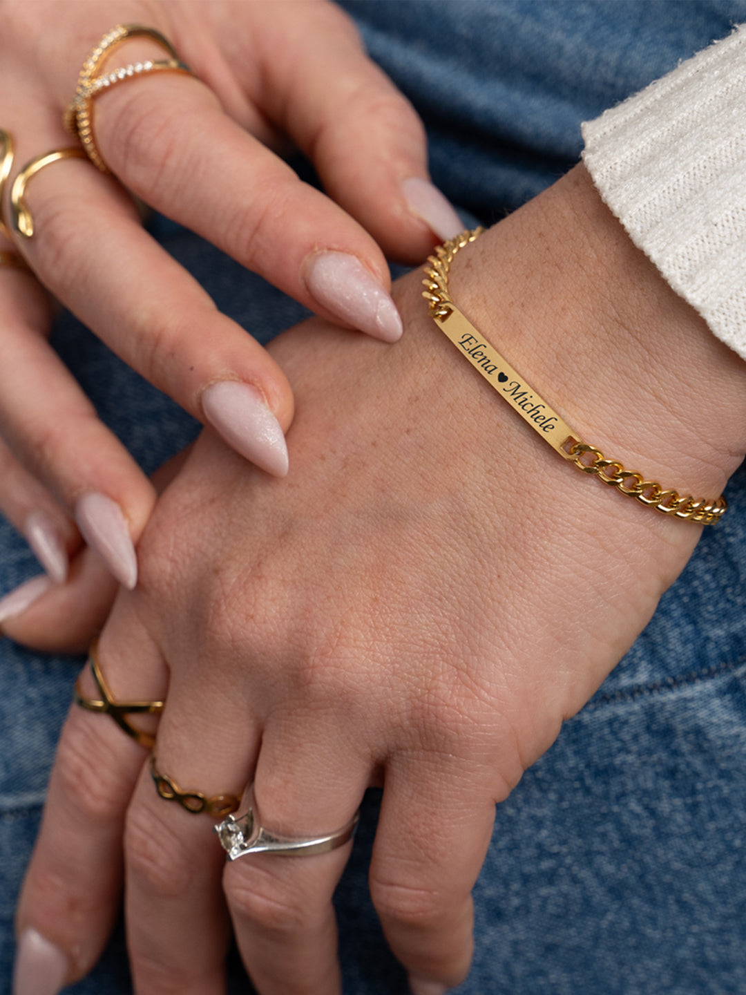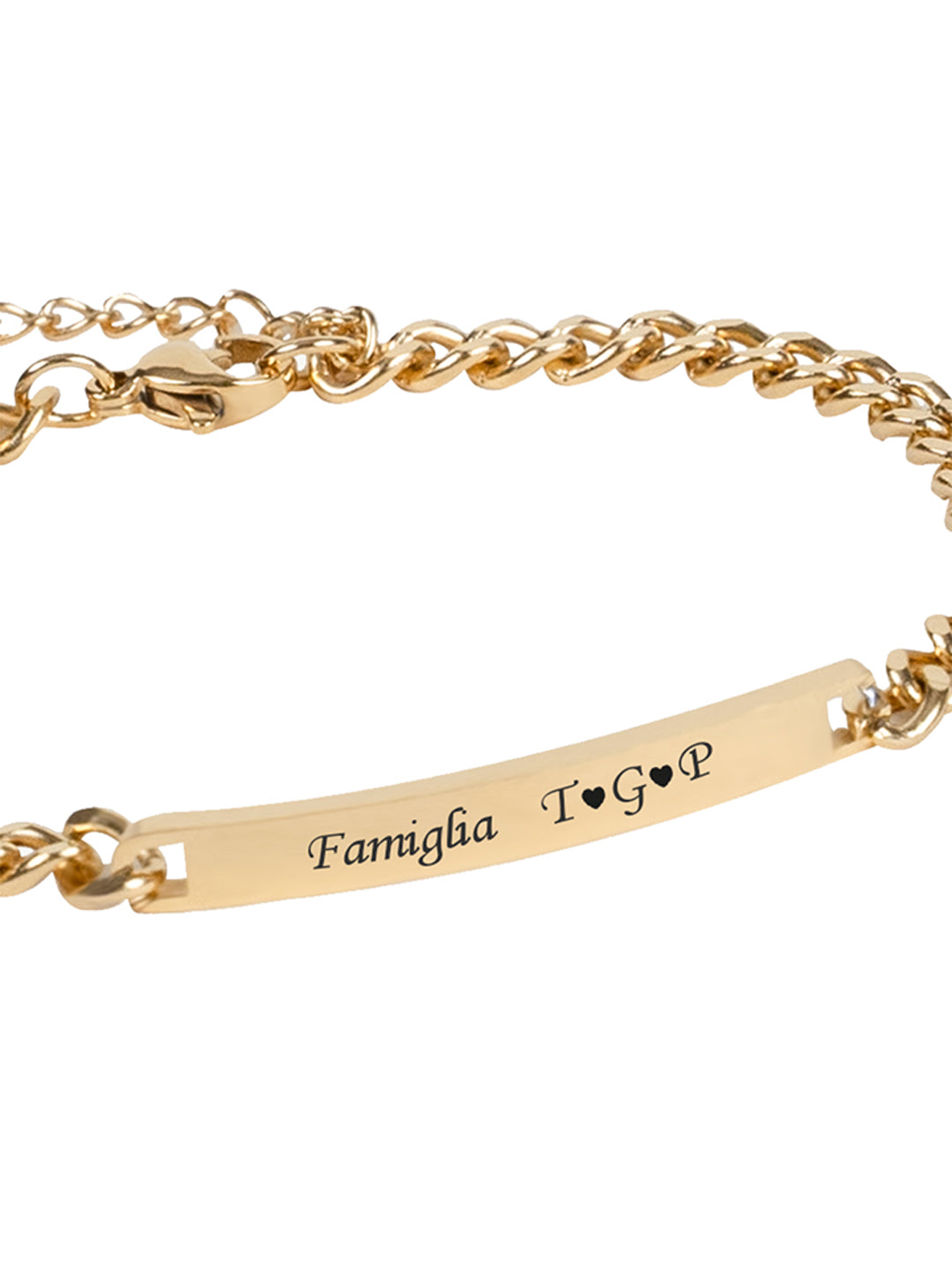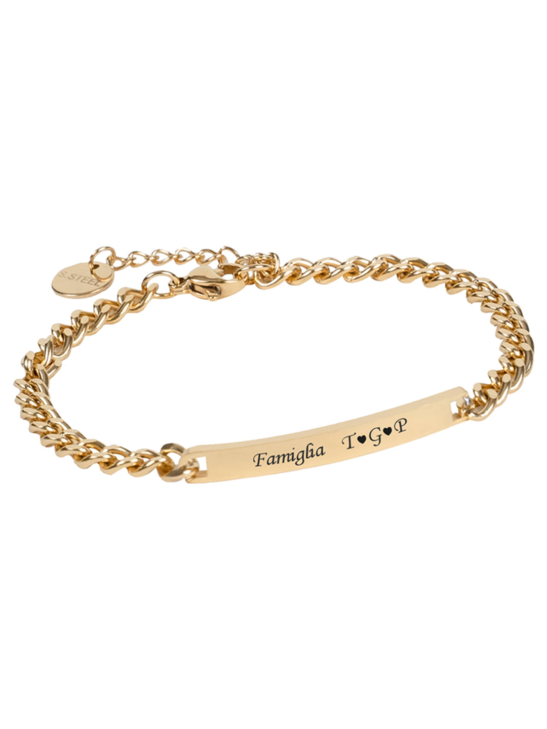 Bracciale dal design minimalista realizzato in acciaio inossidabile anallergico. La targhetta centrale può essere incisa con un nome, una data o una frase significativa rendendo questo bracciale un gioiello davvero unico e personale.