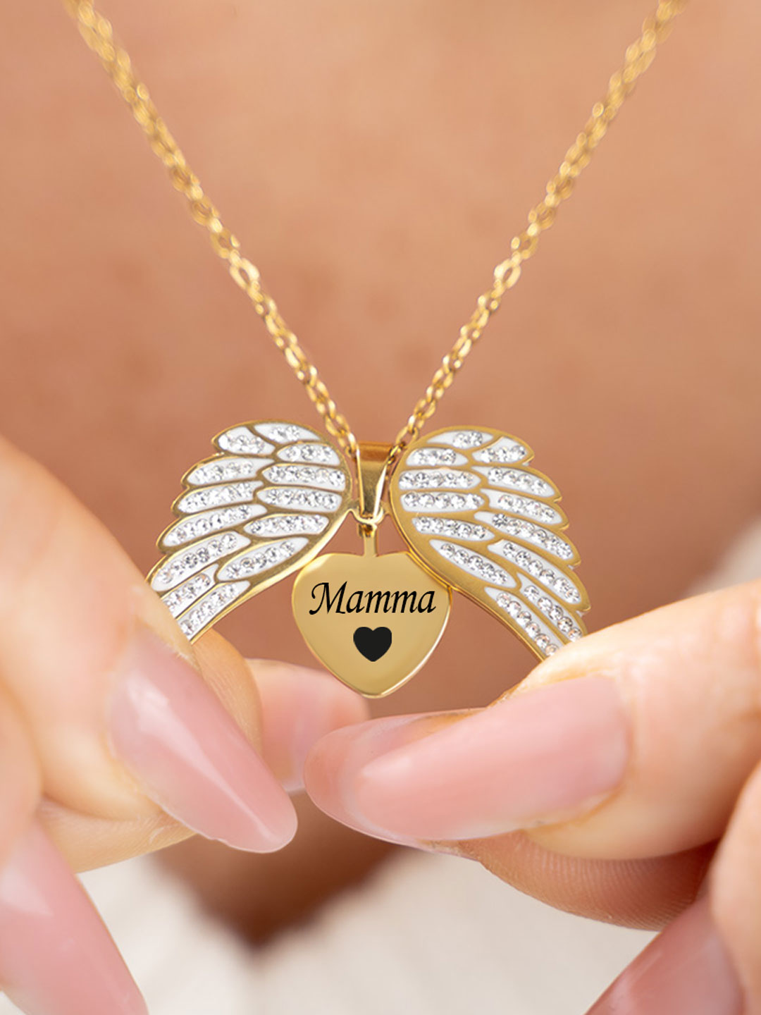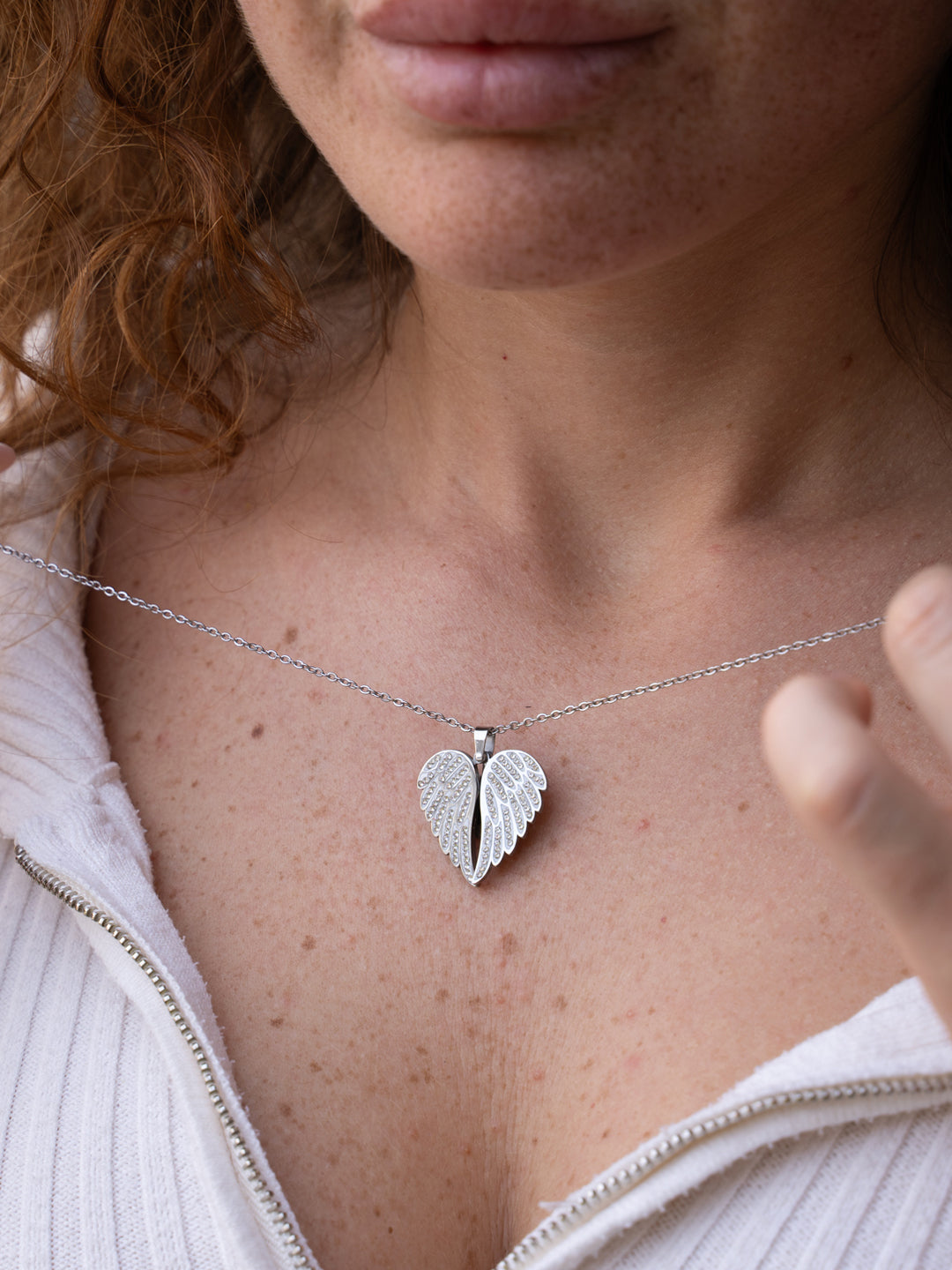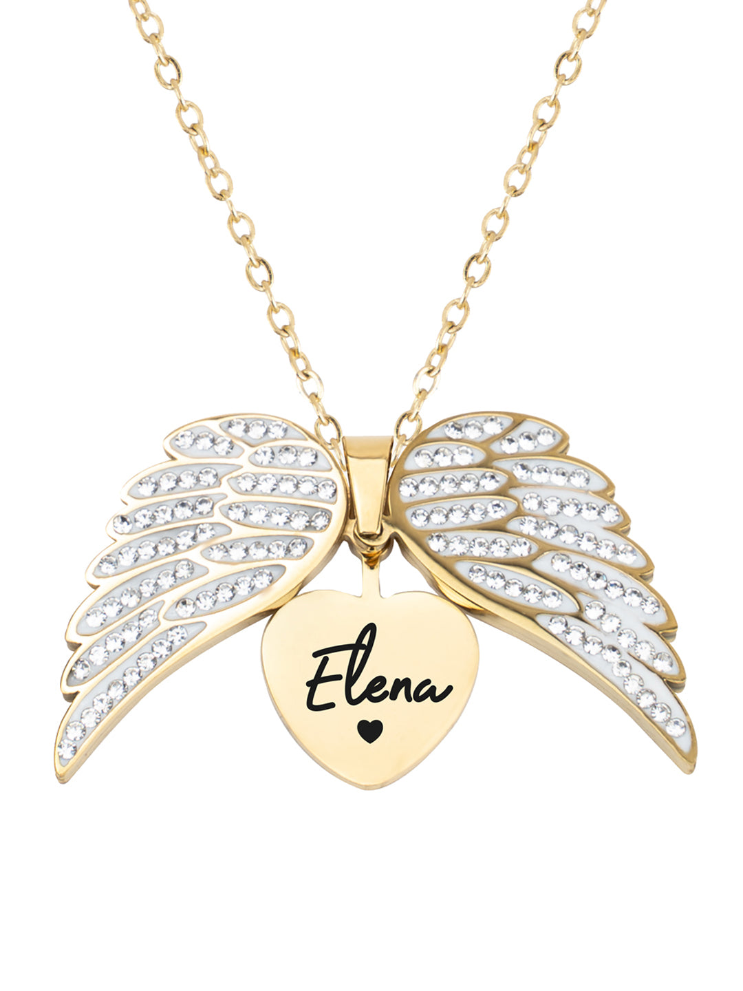 Questa collana cattura l'essenza angelica con due ali finemente lavorate che si aprono per rivelare un cuore prezioso. Il cuore all'interno delle ali può essere inciso con il nome, l'iniziale o una foto della persona cara, rendendo questa collana un regalo davvero unico e personalizzato. Realizzata in acciaio inossidabile con zirconi che donano un tocco di luce.