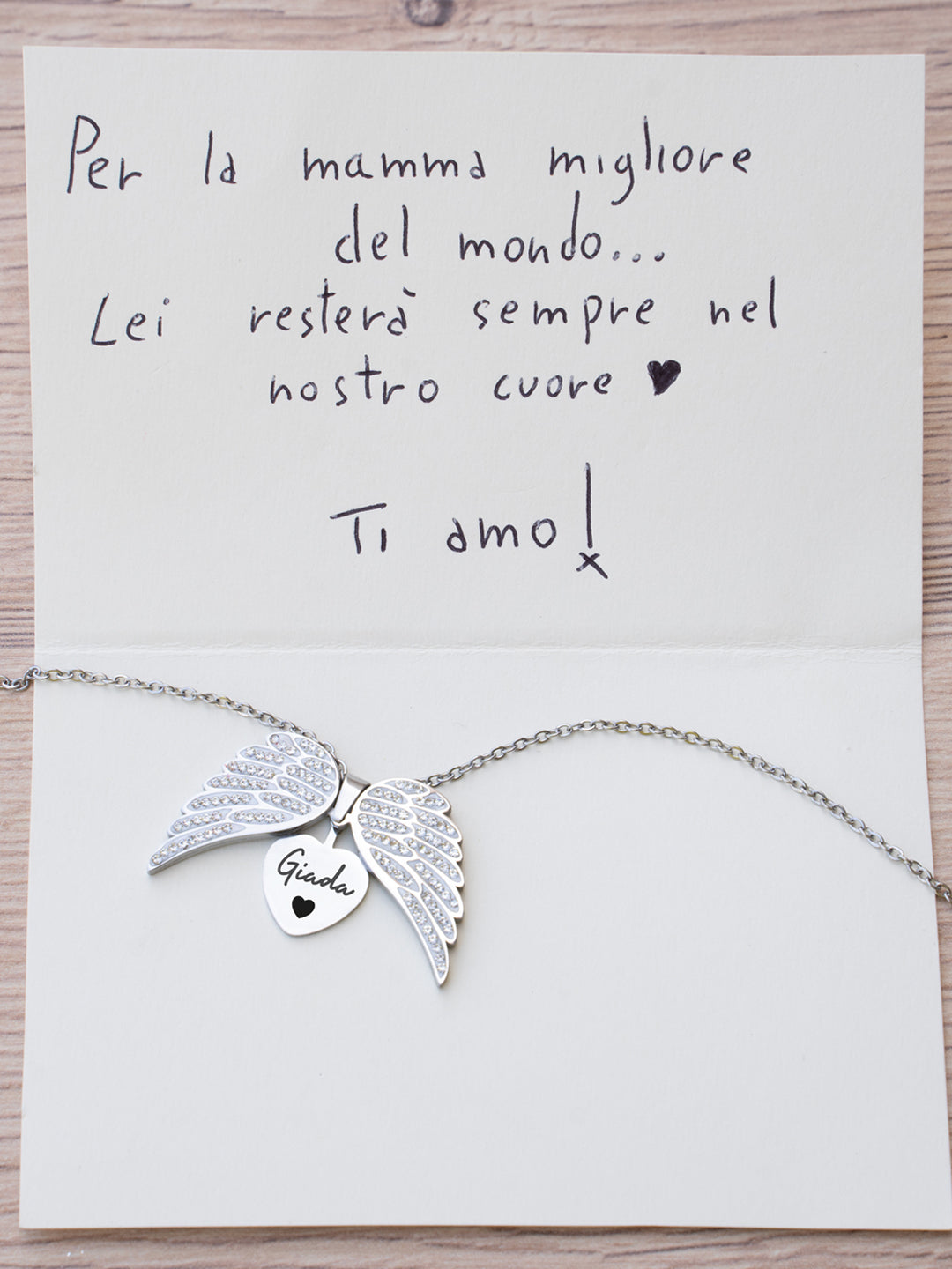Personalizza questa collana stupendo scegliendo l'incisione sul cuoricino che compare sotto alle ali, l'incisione è indelebile e resterà nel tempo.