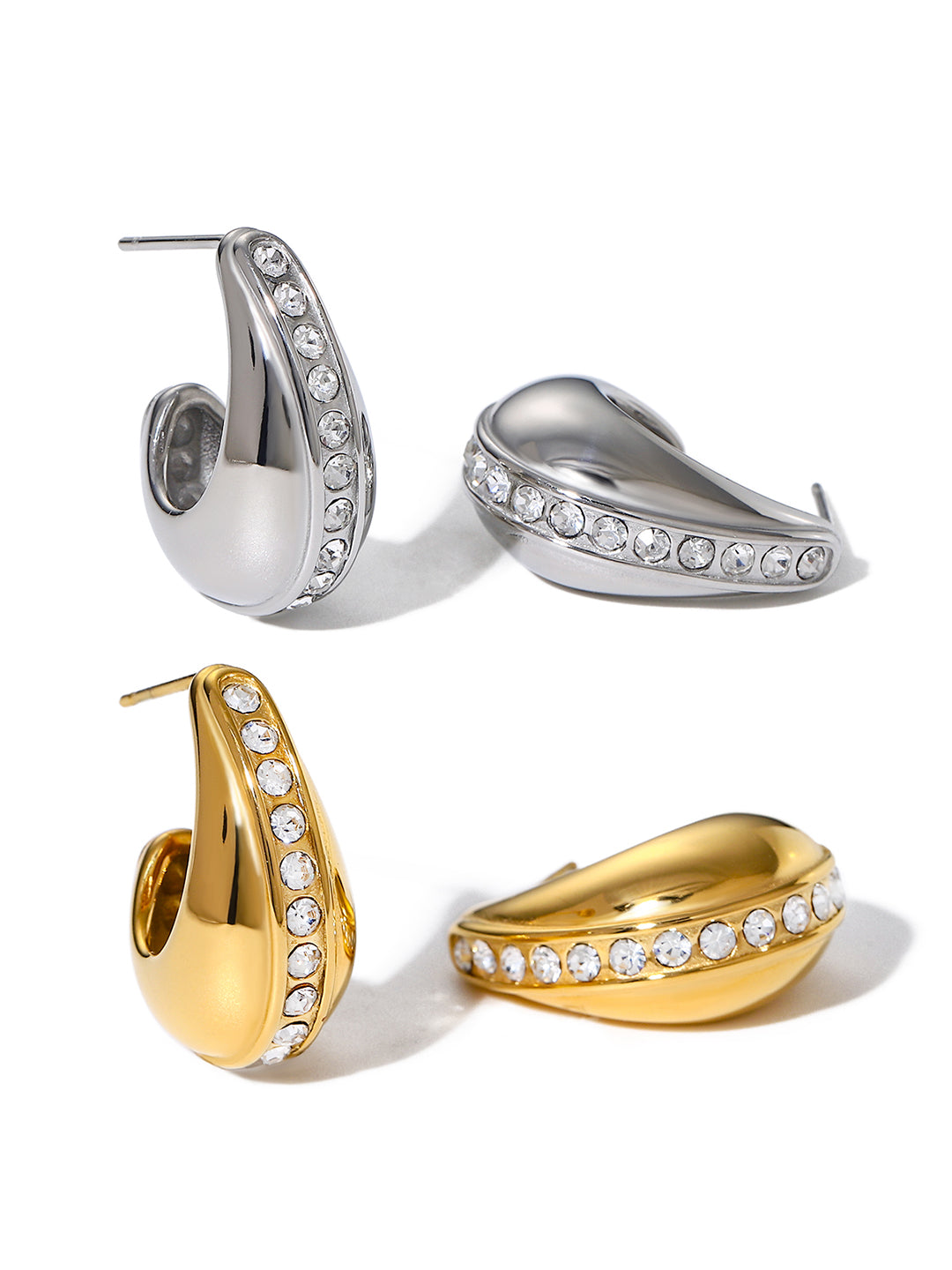Realizzati in acciaio inossidabile placcato oro/argento, con cristalli incastonati. Altezza: 2.6 cm, larghezza: 1.6 cm, peso: 16.6 g. I materiali sono ipoallergenici e resistenti all'acqua.