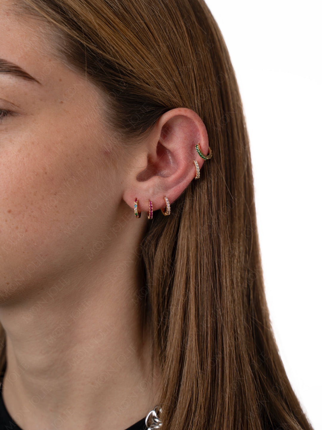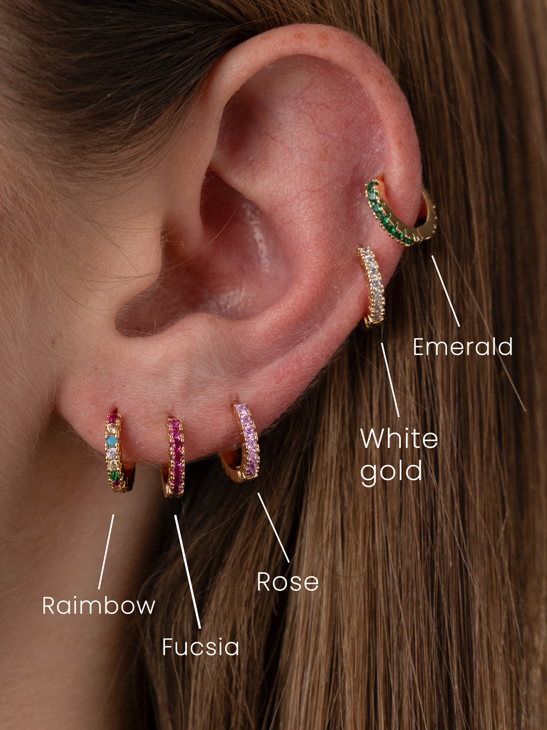Gli orecchini CircleHoops di Moon Jolie sono disponibili in cinque splendide tonalità: Rainbow, Fucsia, Rose, Emerald e White Gold.