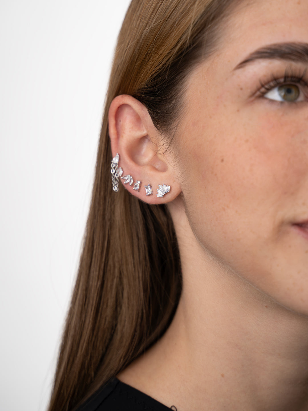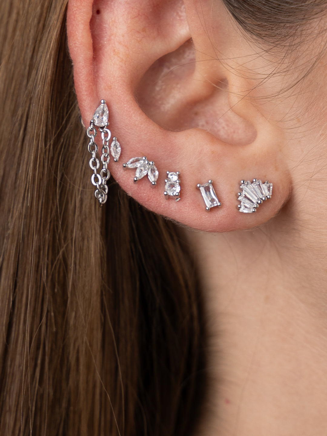 Ogni orecchino presenta un design unico: dalle piccole gemme singole e delicate agli elementi più vistosi a ventaglio e a catena.