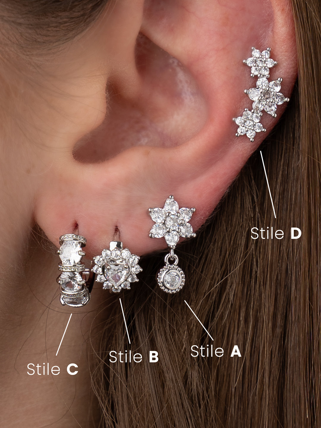 Spirit è un set di orecchini con zirconi, composto da quattro diversi stili: A, B, C e D. Ogni orecchino ha un design unico che spazia dalle forme floreali agli eleganti cerchi, perfetti per creare combinazioni personalizzate.